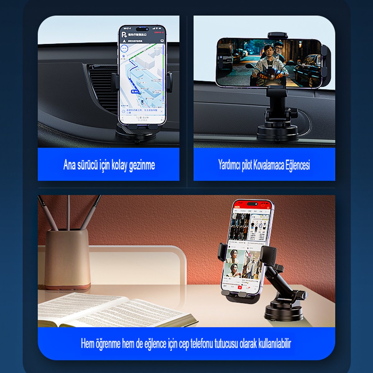 Tutucu, aracınızın düz yüzeylerine güvenli bir şekilde monte edilebilen güçlü bir yapışkan taban içerir. Bu yapışkan taban, tutucunun sağlam bir şekilde sabitlenmesini sağlar ve sarsıntılara karşı dayanıklıdır. Montaj işlemi oldukça basittir ve tutucu, aracınızın iç yüzeyine zarar vermeden kolayca takılıp çıkarılabilir.