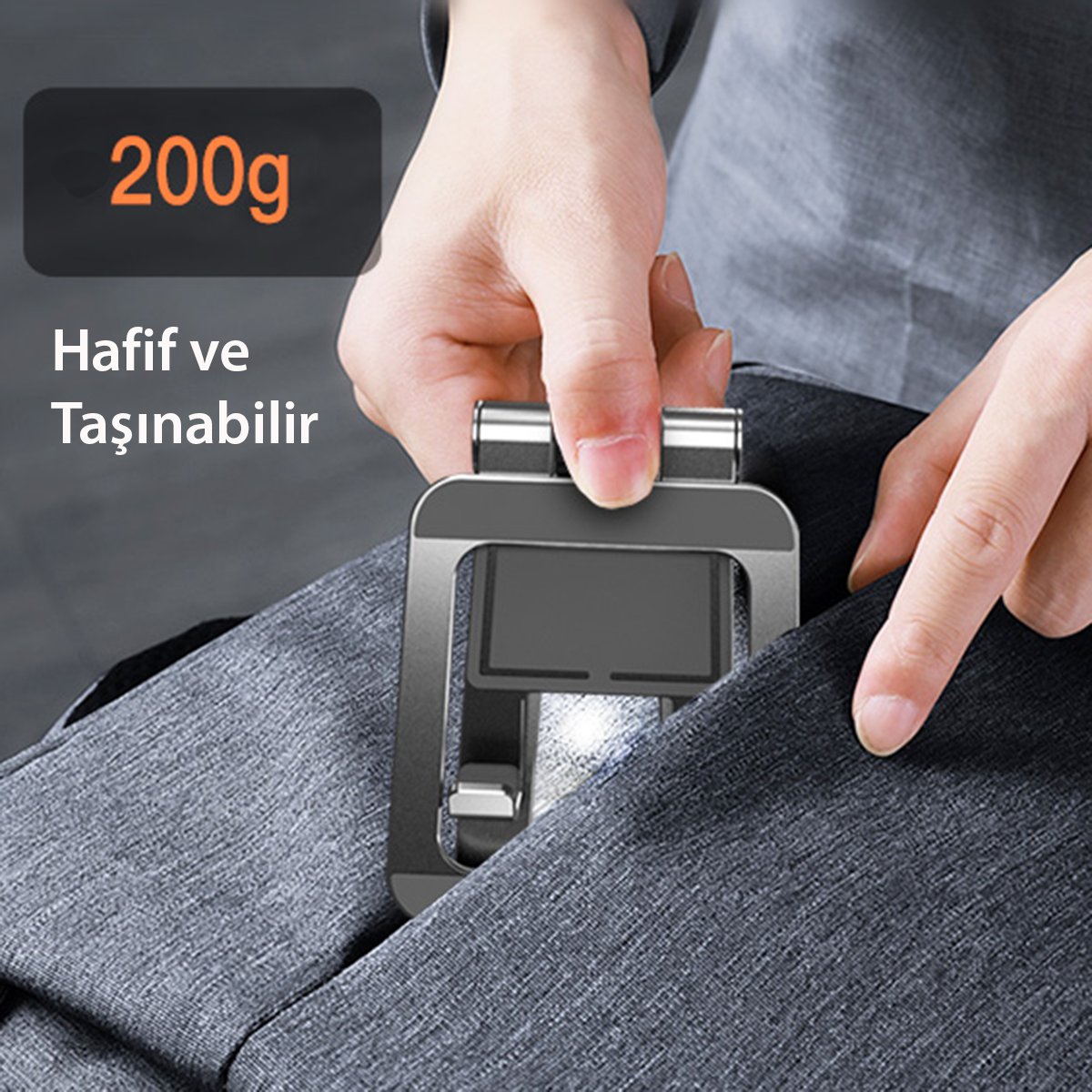 Stand, katlanabilir özelliği sayesinde pratik bir kullanım sunar. Katlandığında kompakt bir boyuta gelir, böylece kolayca taşınabilir ve saklanabilir. Bu özellik, standı çantanızda veya masa çekmecenizde yer açmak için ideal kılar ve seyahatlerinizde rahatça yanınıza almanızı sağlar.