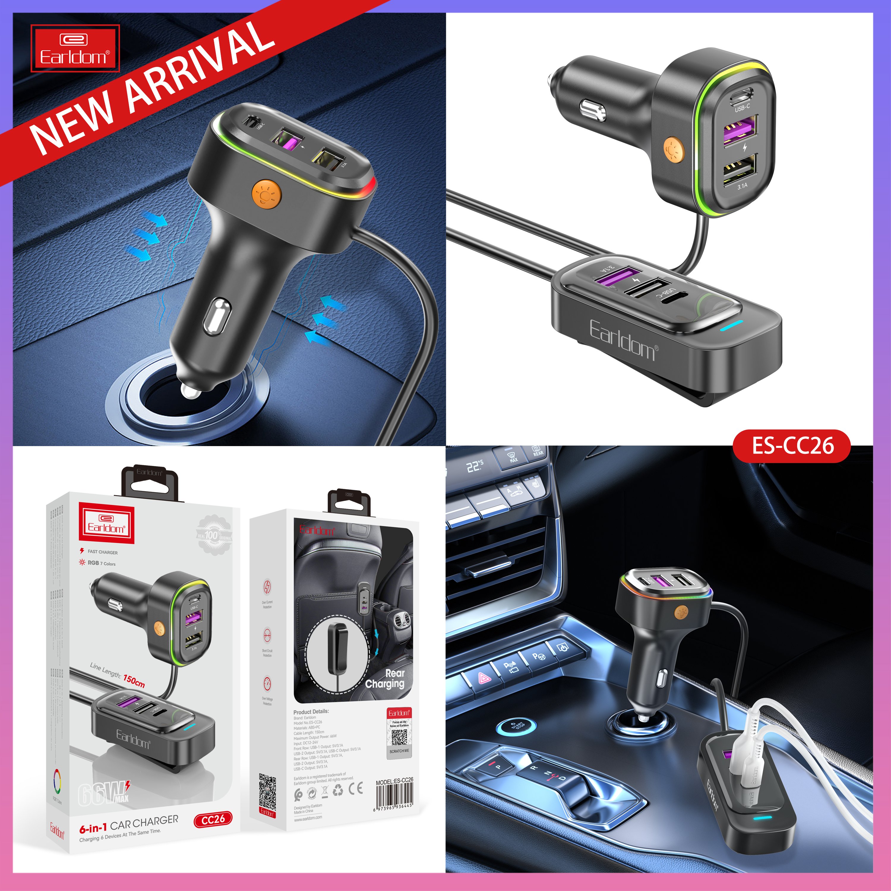 Earldom ES-CC26 1.5M Dahili Uzatıcı Kablolu 2 Adet Type-C ve 4 Adet Usb Çıkışlı RGB 66W PD Hızlı Araç Şarj