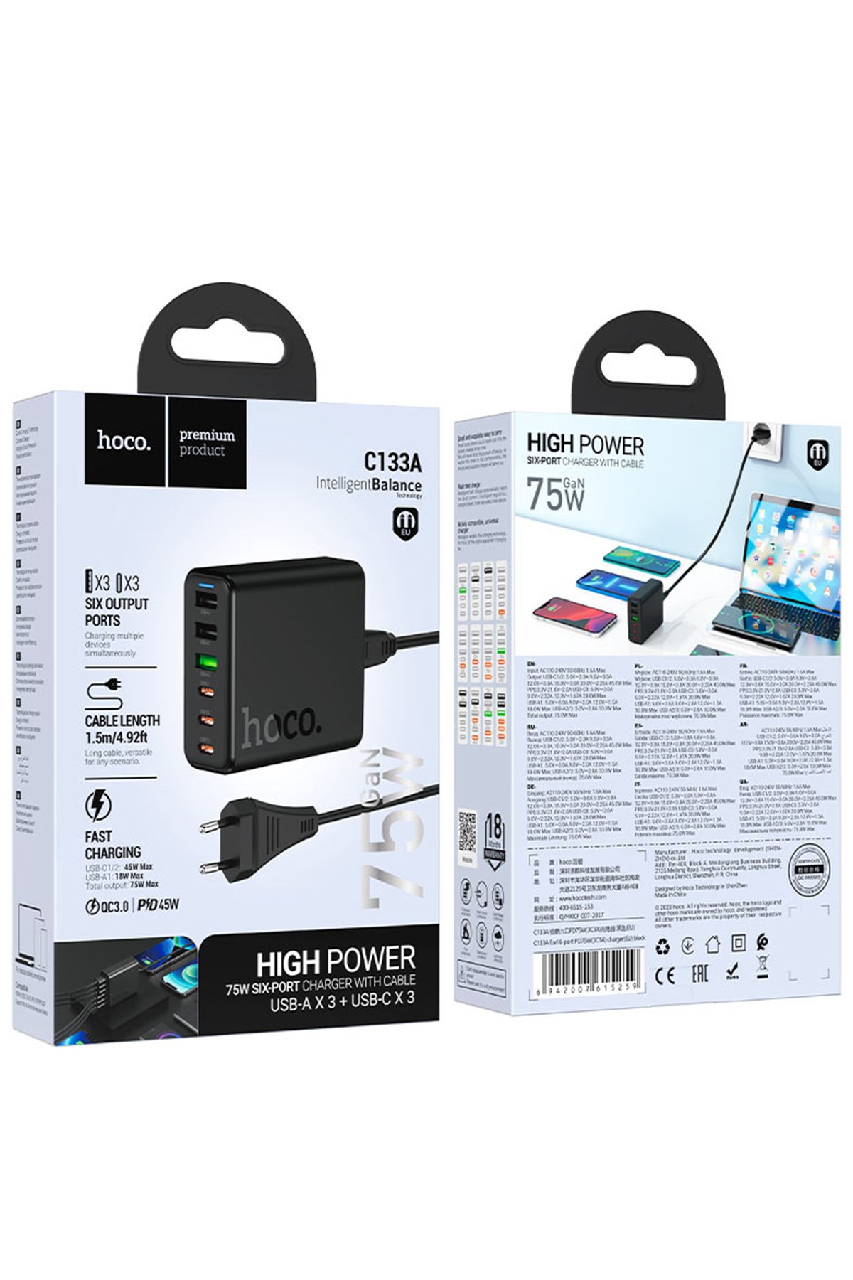 Hoco C133A 1.5M Kablolu 3 Adet Type-C ve 3 Adet USB Çıkışlı 75W GAN PD GAN Masaüstü Şarj Adaptörü