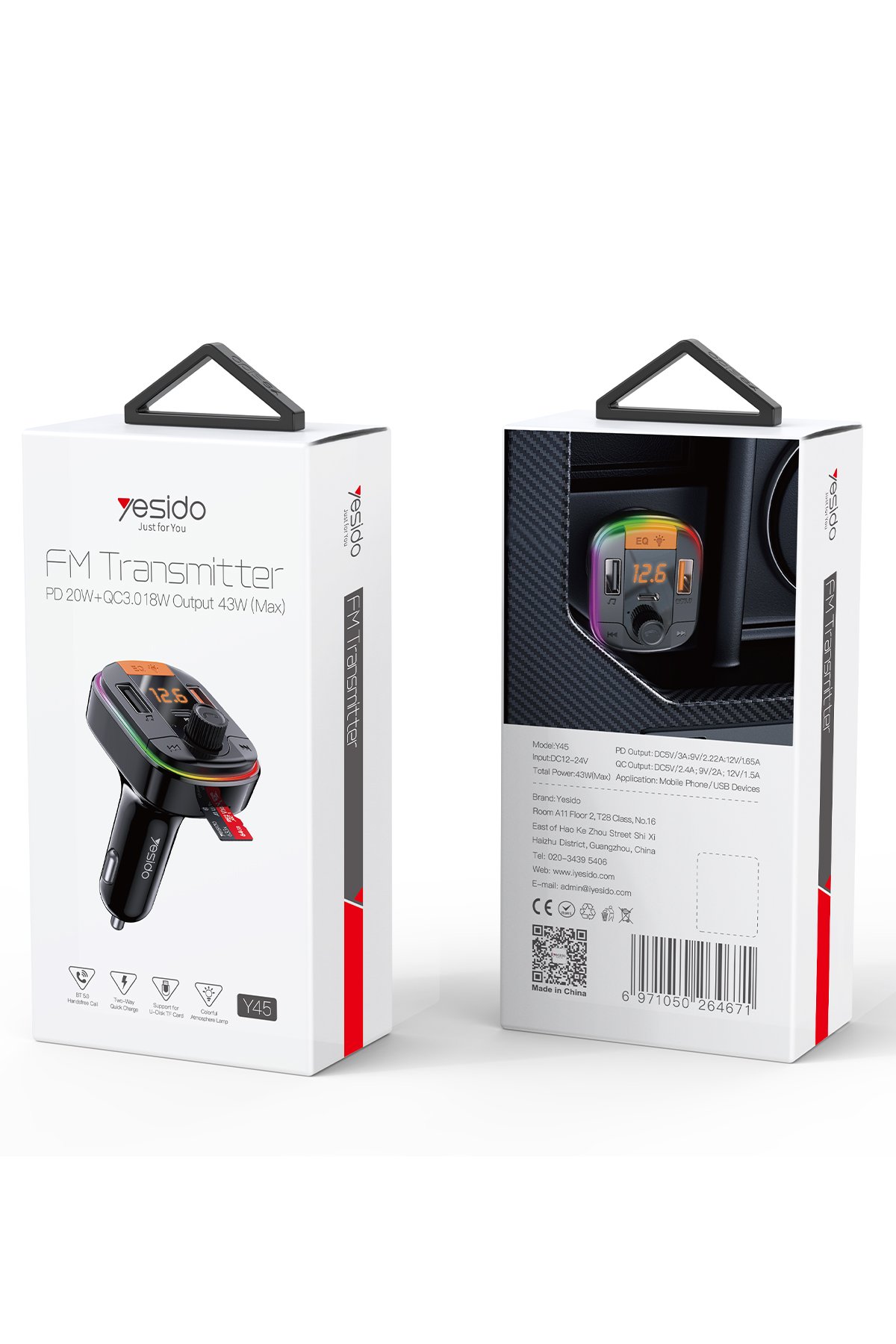 Yesido Y45 1 Adet 18W PD Type-C Çıkışlı ve 1 Adet QC 3.0 USB Çıkışlı BT 5.0 RGB FM Transmitter